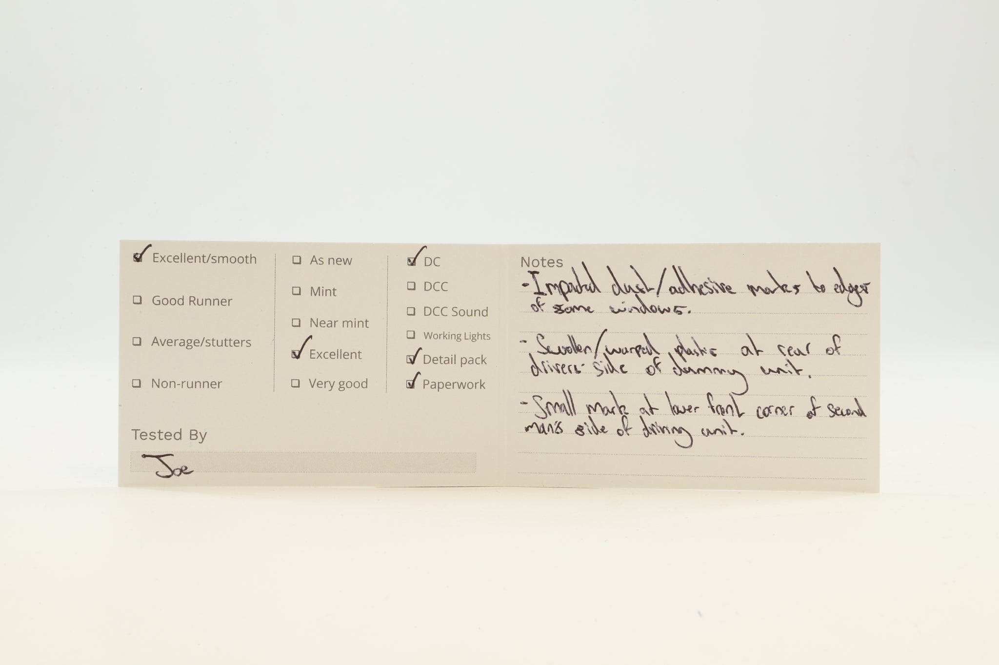Excellent-Impacted dust/adhesive marks to edges of some windows. Swollen /warped plastic at rear of drivers side of dummy unit. Small amrka t lower front corner of seconndman's side of driving unit