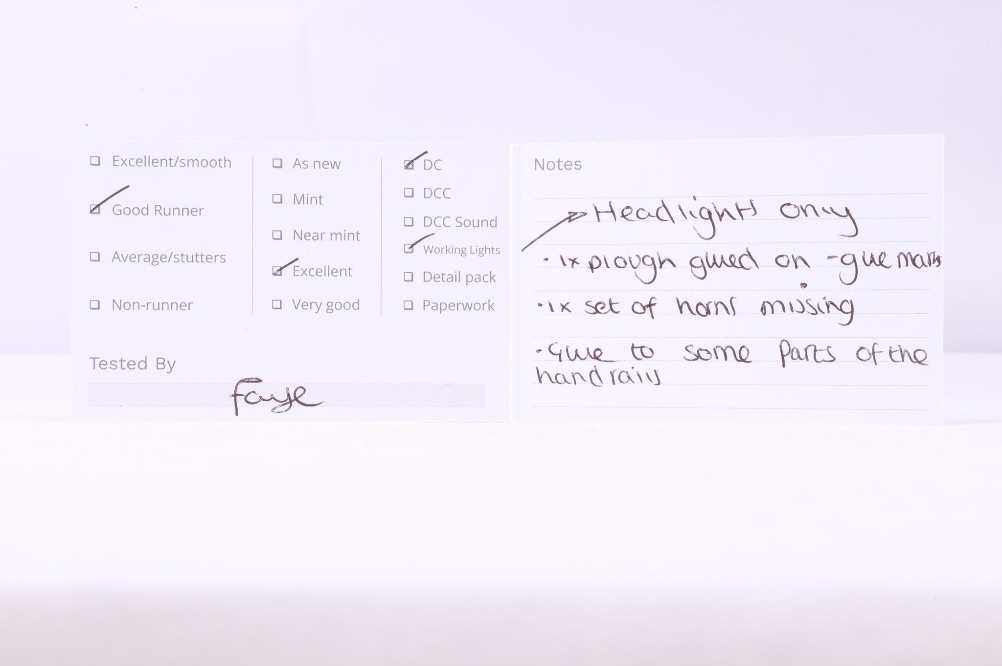 Excellent - 1 x plough is glued on (glue marks this this), 1 x set of horns are mine & there is glue to some parts of the handrails