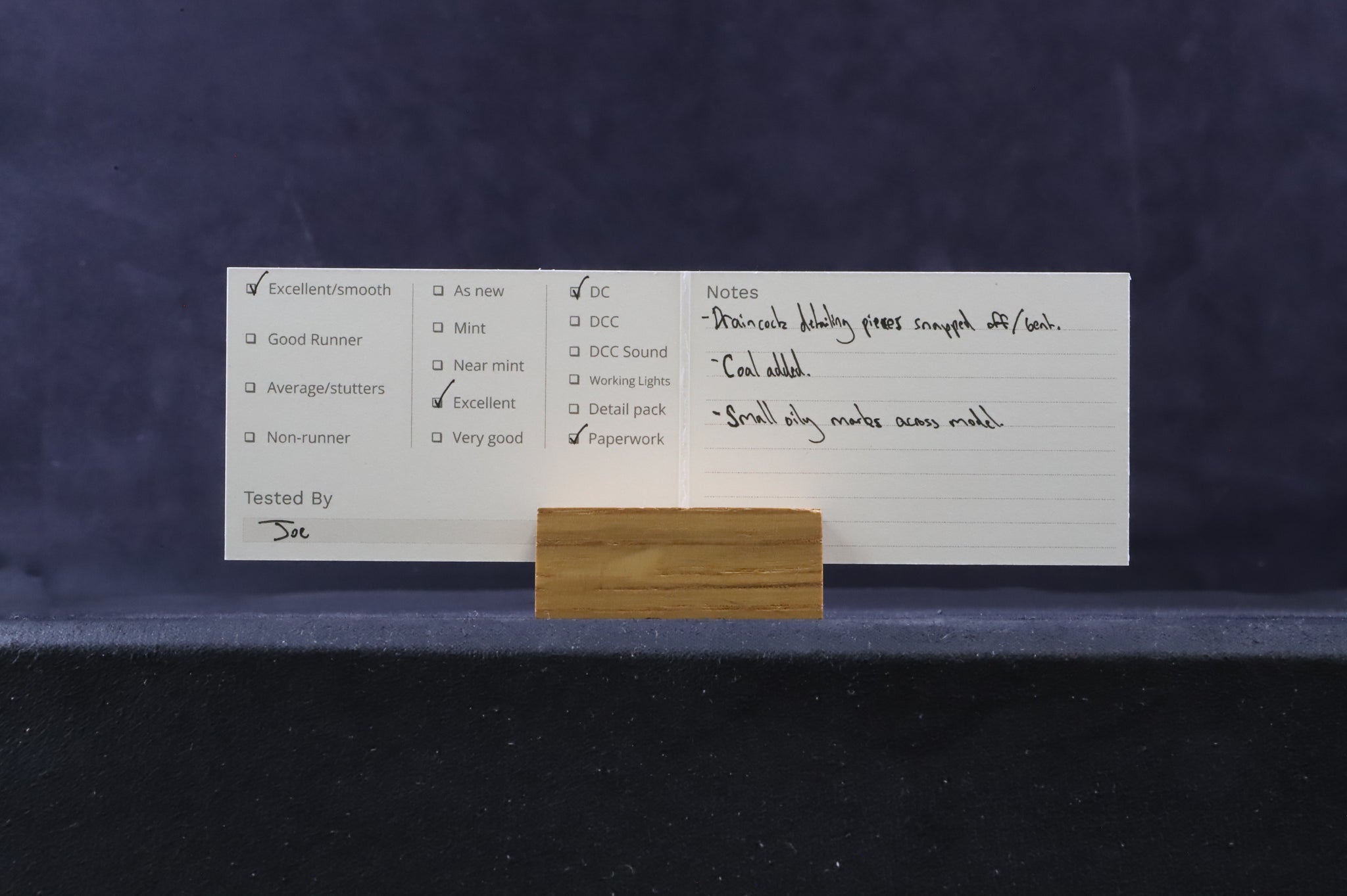 Excellent-Draincock detailing pieces snapped off/bent. Small oily marks across model. Coal added