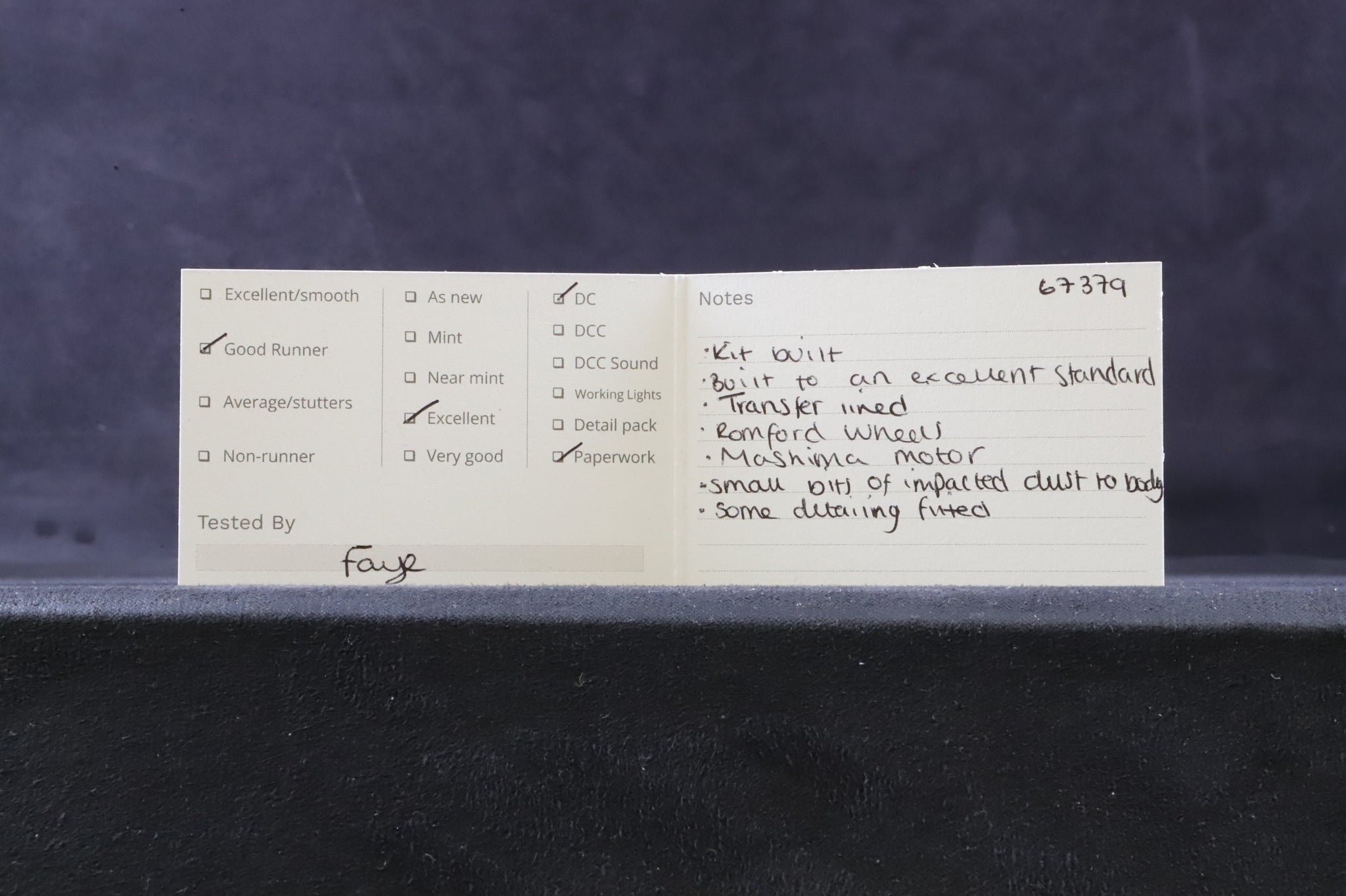 Excellent - Built to an excellent standard with small bits of impacted dust to the body and some detailing fitted. The model has been transfer lined and fitted with Romd=ford wheels and Mashima motor.