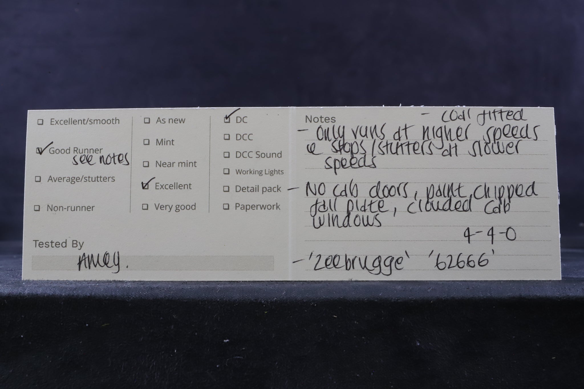 Excellent - the model has been built and painted to a good standard. There are no cab doors, the fall plate is paint chipped and the cab windows are clouded. A coal load has been fitted.