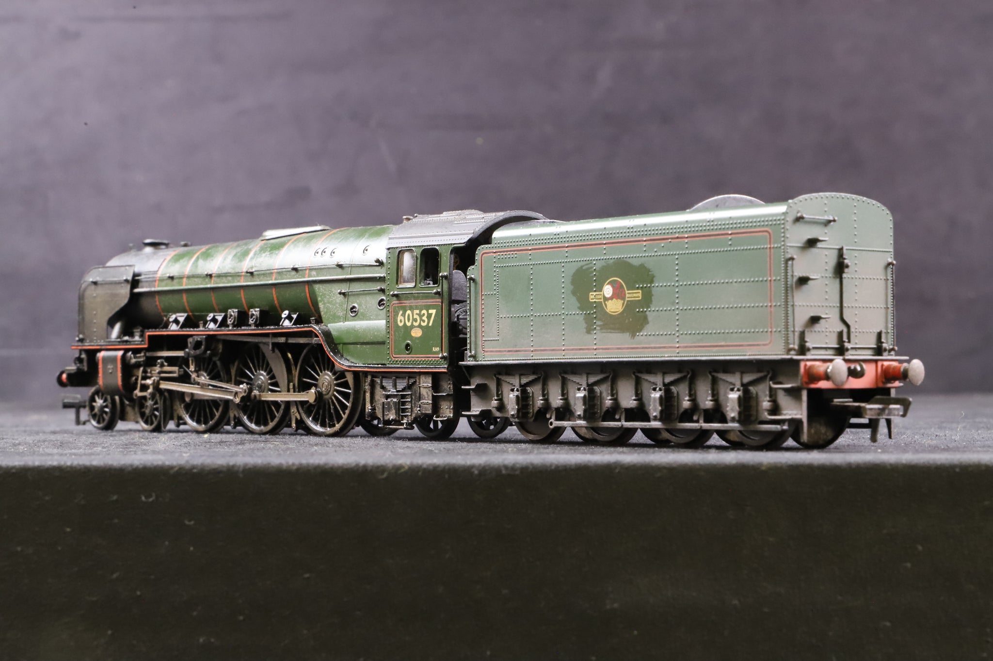Workshop: Weathered, with marks to finish. Marks across body. Tender drag box damaged. Loco to tender bar replaced.