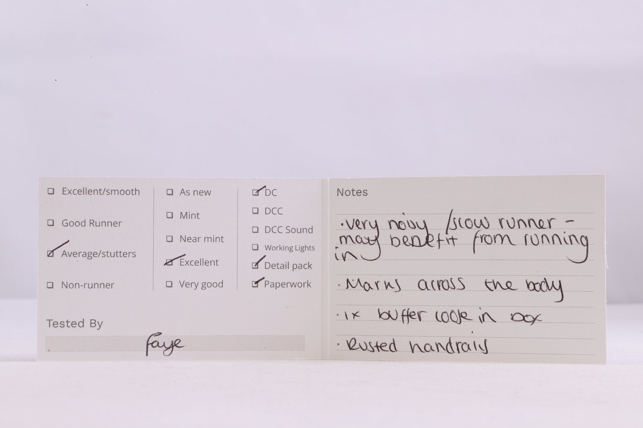 Excellent - Marks across the body, 1 x buffer is loose in the box & the handrails are rusted.