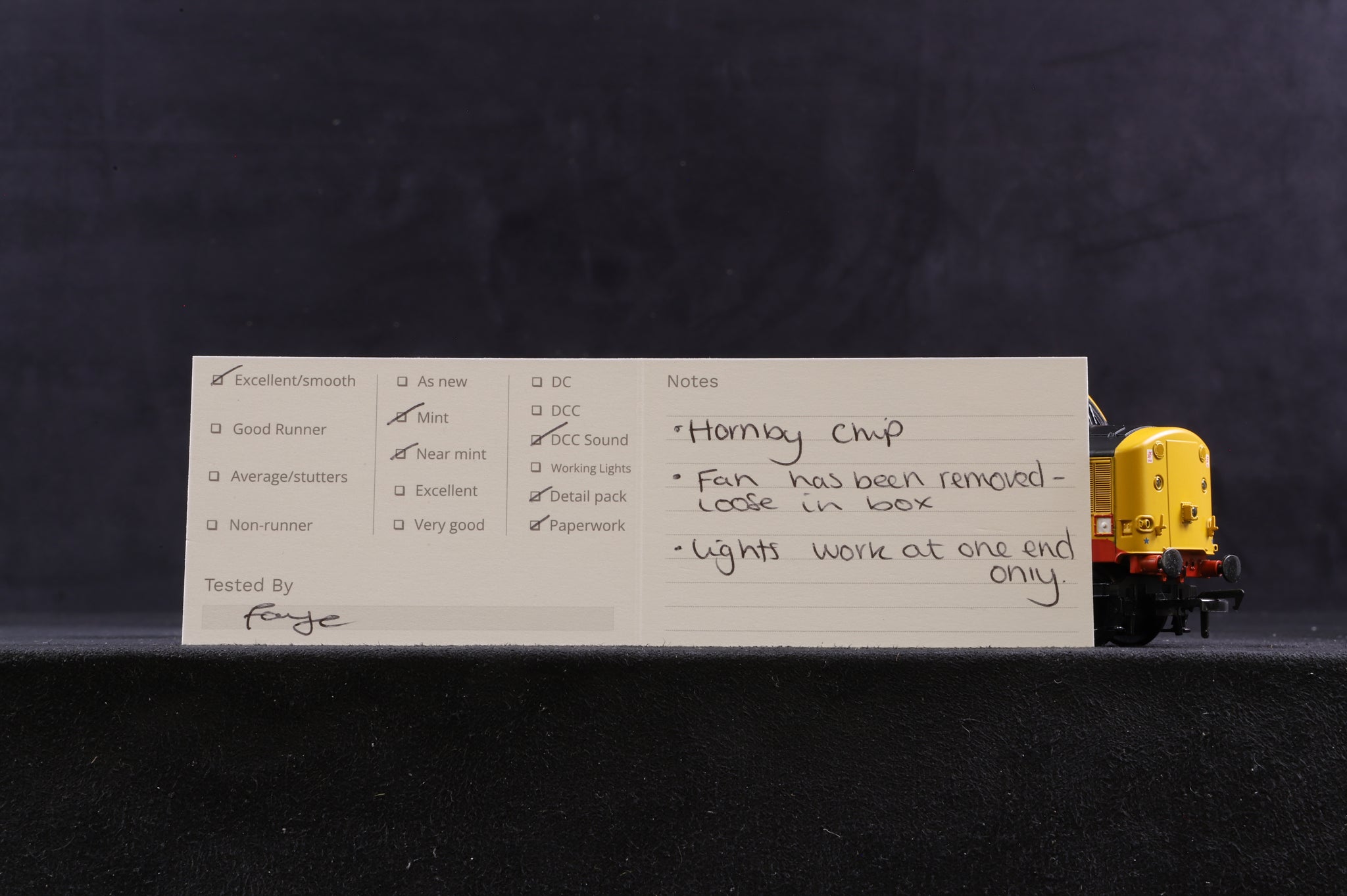 All our OO gauge models are track tested, excellent smooth runner at both low and high speeds. The lights work at one end only. Hornby chip.
