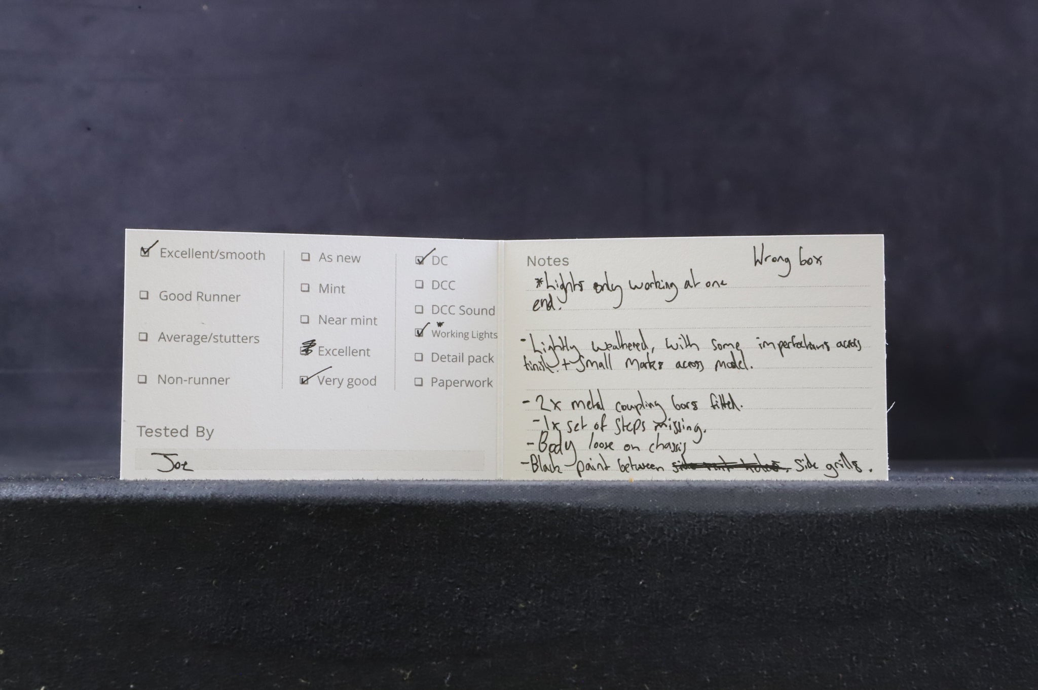 Very good-Lightly weathered, with some imperfections across finish and small marks across model.n 2x metal coupling bars fitted. 1x set of steps missing. Body loose on chassis. Black paint engrained into side grills